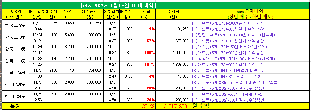 5일(수) elw 매매에서는 단타 매매로 합=361% 수익을 챙겼습니다. 투자원금 4개(1개=100만원 기준)로 단타 대응해 361만원 수익이네요. 매수 걸기 후 매도 걸기를 제시해 직장인도 만족하는 리딩입니다. 하락장 상승장 상관없이 매일매일 수익 챙기는 안정적인 고수익 elw 매매 급등락장에서 더 큰 수익을 내는 elw 매매에 동참해 보십시오.