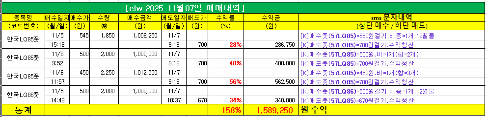 7일(금) elw 매매에서는 단타 매매로 합=158% 수익을 챙겼습니다. 투자원금 4개(1개=100만원 기준)로 단타 대응해 159만원 수익이네요. 매수 걸기 후 매도 걸기를 제시해 직장인도 만족하는 리딩입니다. 하락장 상승장 상관없이 매일매일 수익 챙기는 안정적인 고수익 elw 매매 급등락장에서 더 큰 수익을 내는 elw 매매에 동참해 보십시오.