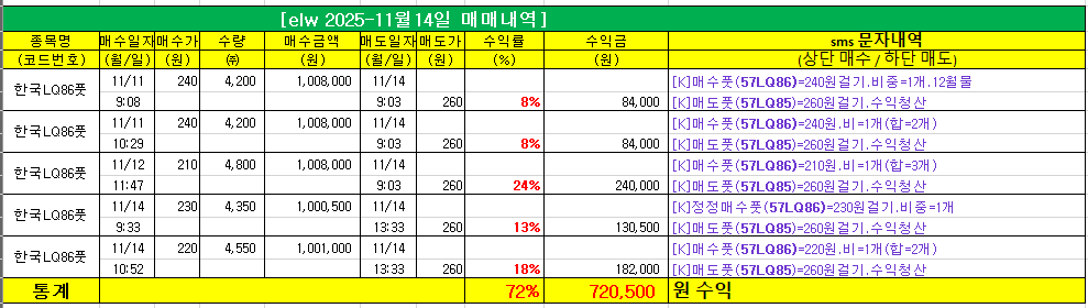 14일(금) elw 매매에서는 단타 매매로 합=72% 수익을 챙겼습니다. 투자원금 1개(1개=100만원 기준)로 단타 대응해 72만원 수익이네요. 매수 걸기 후 매도 걸기를 제시해 직장인도 만족하는 리딩입니다. 하락장 상승장 상관없이 매일매일 수익 챙기는 안정적인 고수익 elw 매매 급등락장에서 더 큰 수익을 내는 elw 매매에 동참해 보십시오.