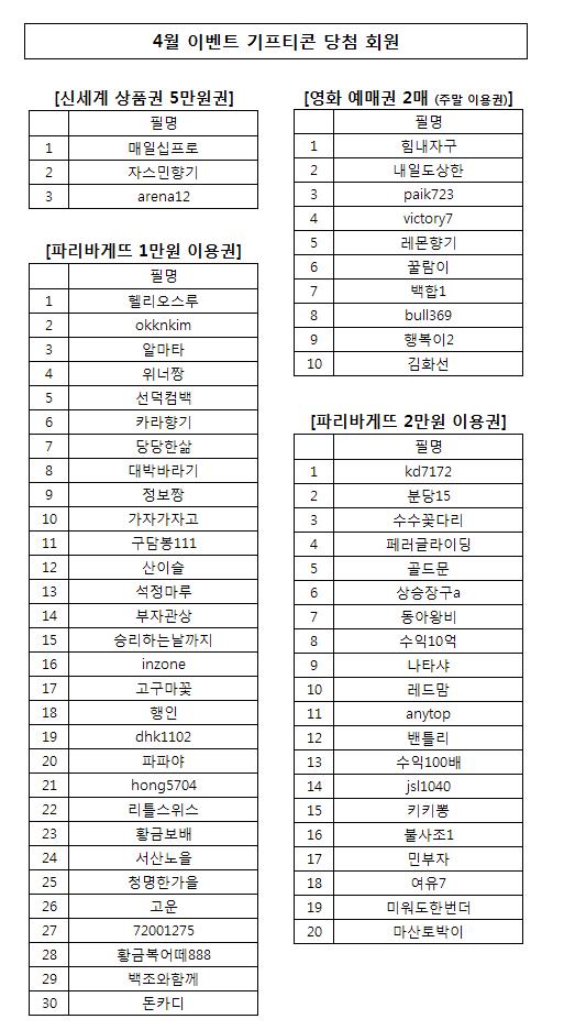 4월 이벤트 '넝쿨째 굴러들어온 혜택' 당첨자 명단입니다.
