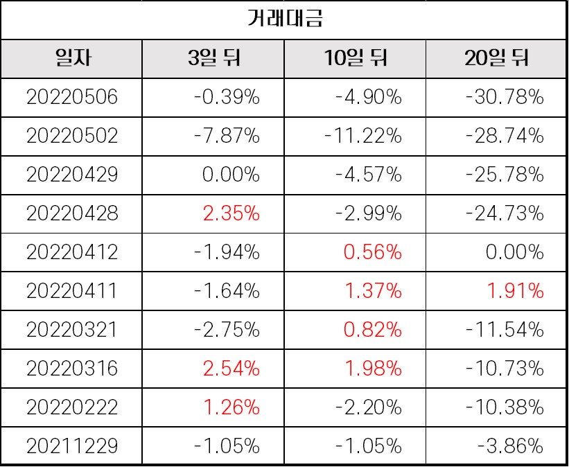 최근 1년 직전 대비 최근 평균 거래대금 증가가 0.45~0.55배 이상이었던 날의 종가 기준 주가 변동(최근 10개 시점)