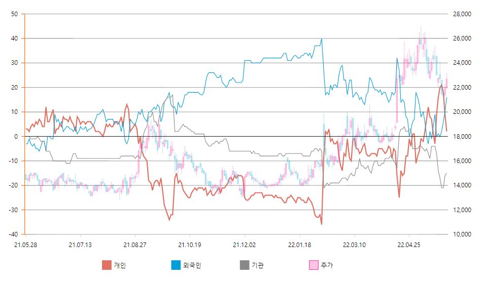 왼쪽-누적순매수(억 원) 오른쪽-주가(원)