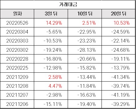 * 최근 1년 직전 대비 최근 평균 거래대금 증가가 1.66배 이상이었던 날의 종가 기준 주가 변동(최근 10개 시점)
