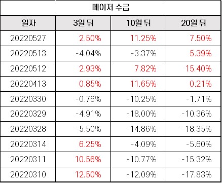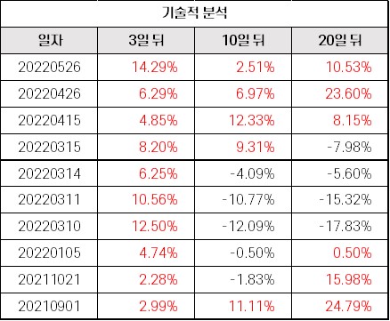 * 최근 1년 ‘3연속 음봉 및 하락’이 발생했던 날의 종가 기준 주가 변동(최근 10개 시점)