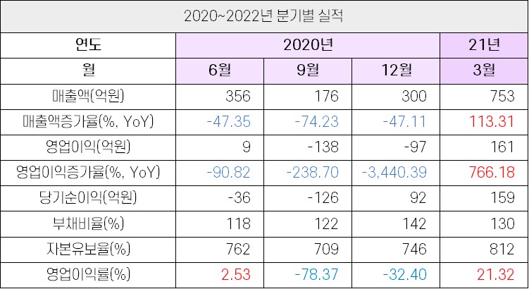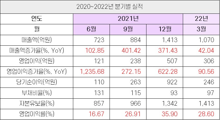- 2022년 1분기도 반도체 호조에 힘입어 매출 1,070억원, 영업이익 306억원(OPM 28.6%)라는 양호한 성과를 기록. DRAM 미세공정과 NAND 단수 증가에 따른 고난도 공정에서 인상적인 성과로 실적 성장 모멘텀 지속 예상.<유진투자증권>