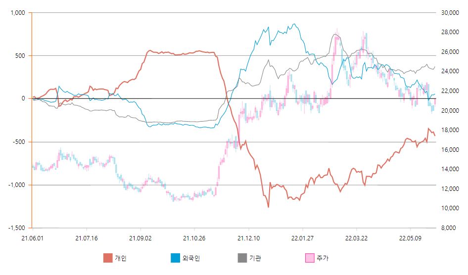 왼쪽-누적순매수(억 원) 오른쪽-주가(원)
